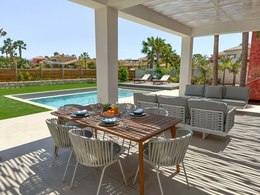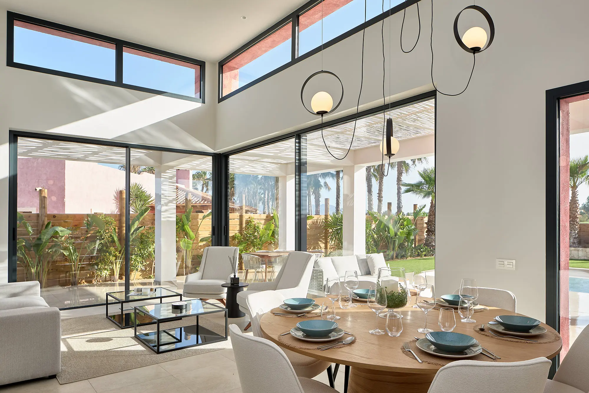 Las características incluyen una amplia zona de recepción interna que se abre, con un suelo de nivel, a las terrazas cubiertas, al jardín paisajístico y a la piscina, para ofrecer un espacio de vida y comedor combinado interior/exterior diseñado con el estilo de vida mediterráneo y el clima especialmente privilegiado de Desert Springs.